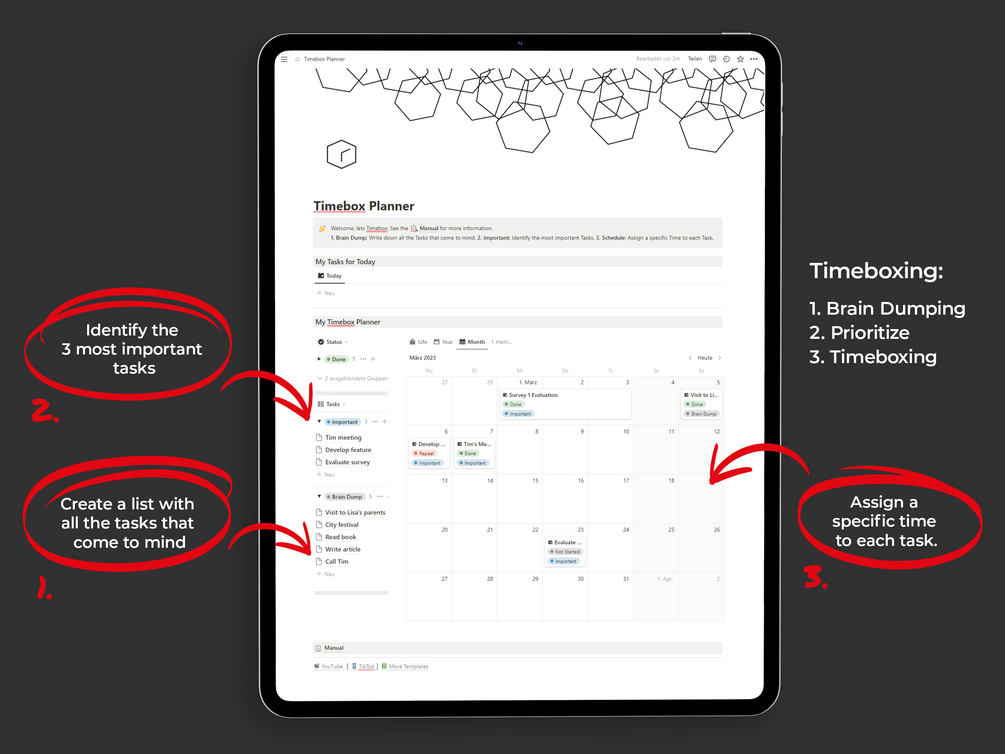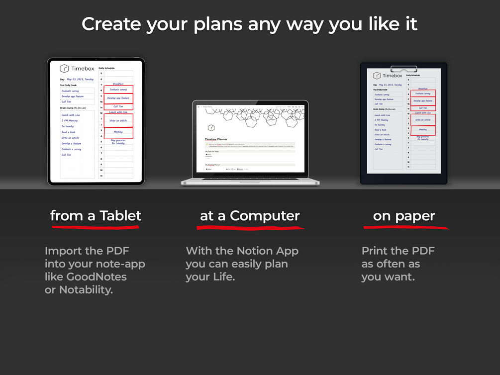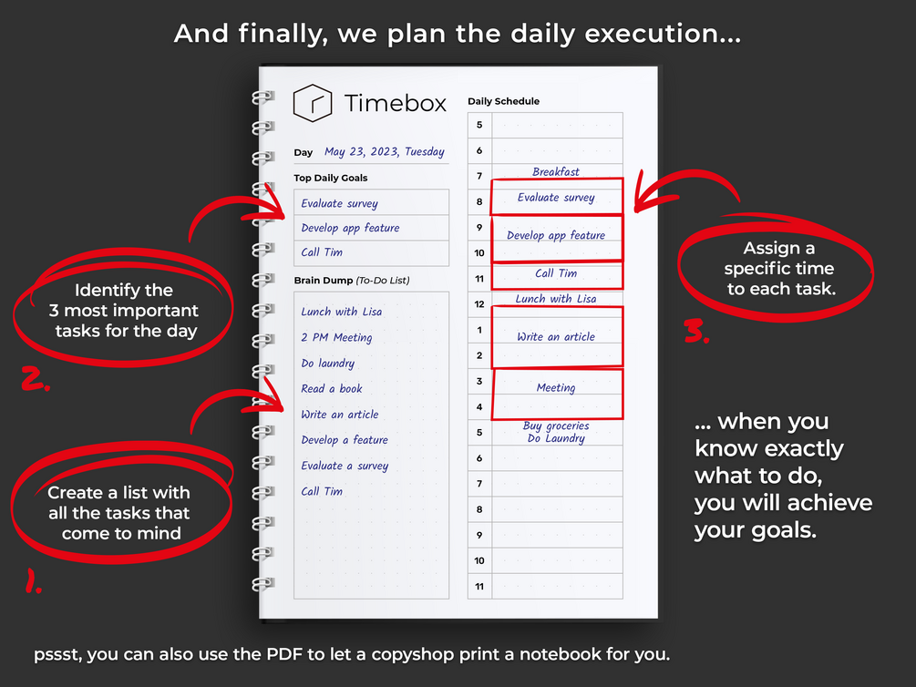 The Timebox-Planner empowers you to define goals, devise strategies for accomplishment, and organize your day effectively to ensure successful goal attainment.